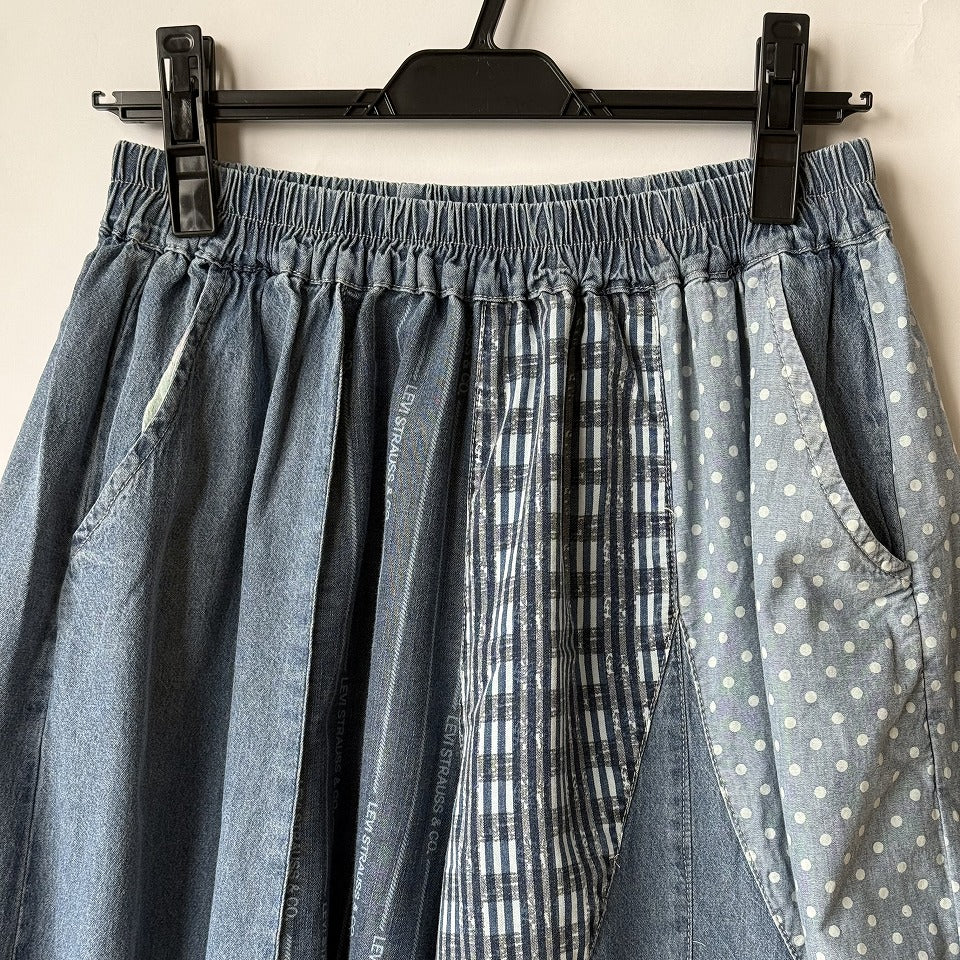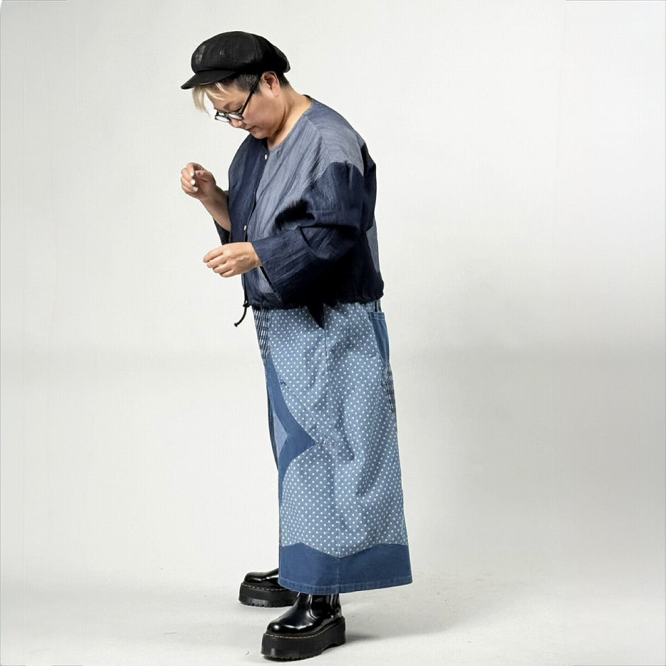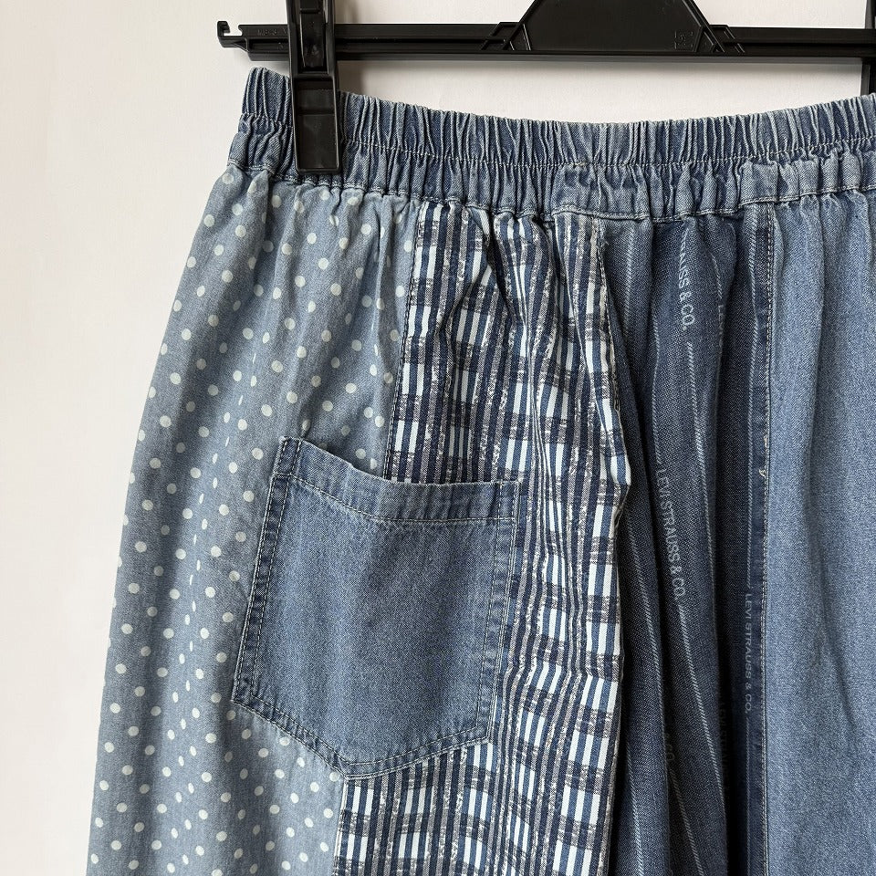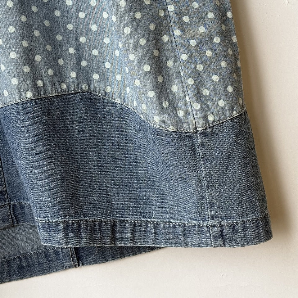 ドット(水玉)・ストライプ・チェック・無地デニムをバランス良く切り替えた、こだわりの異素材デザイン。