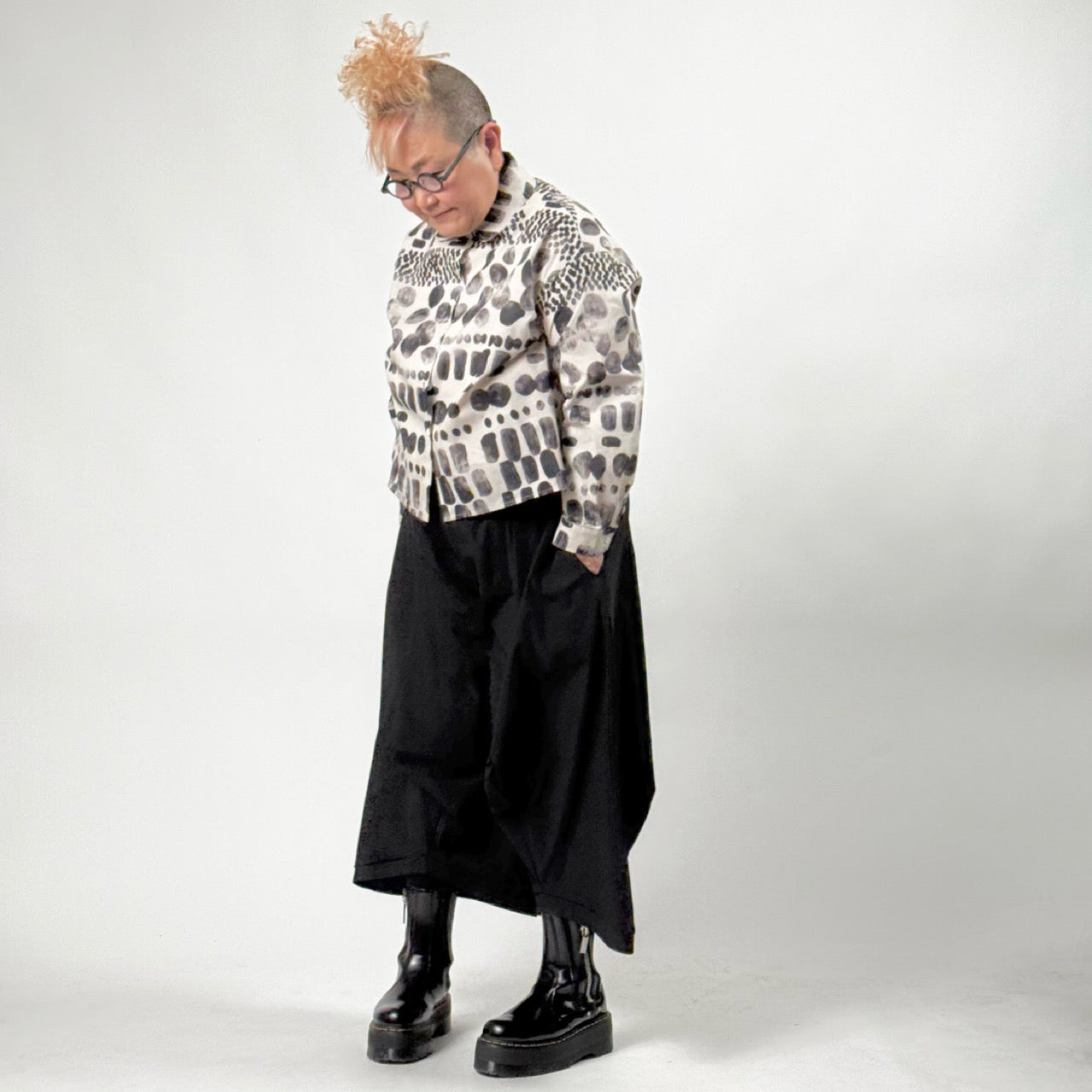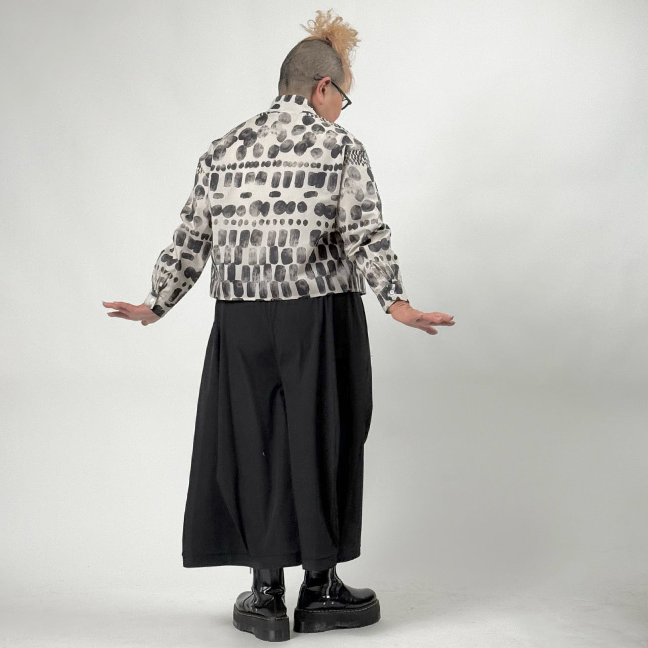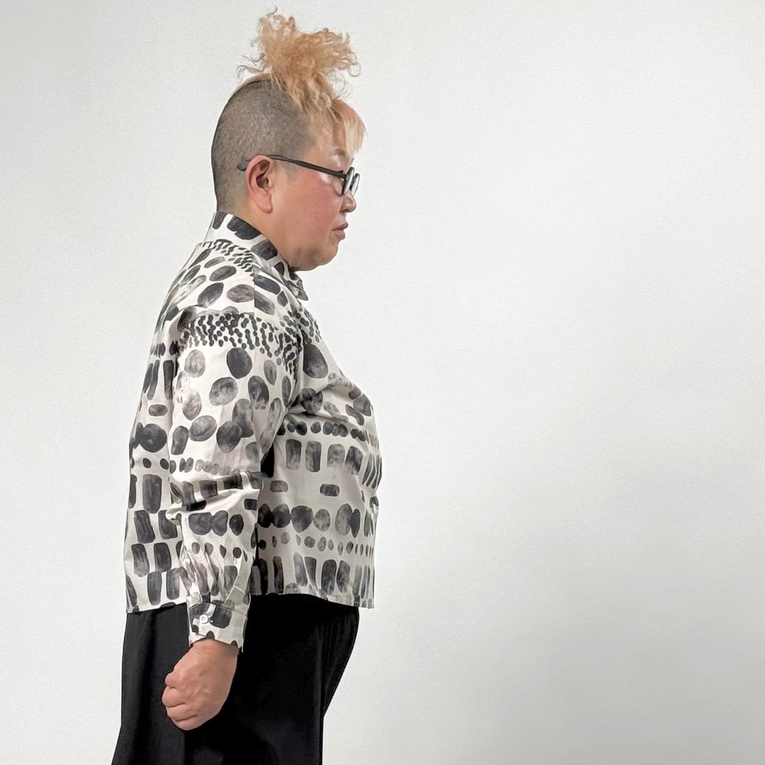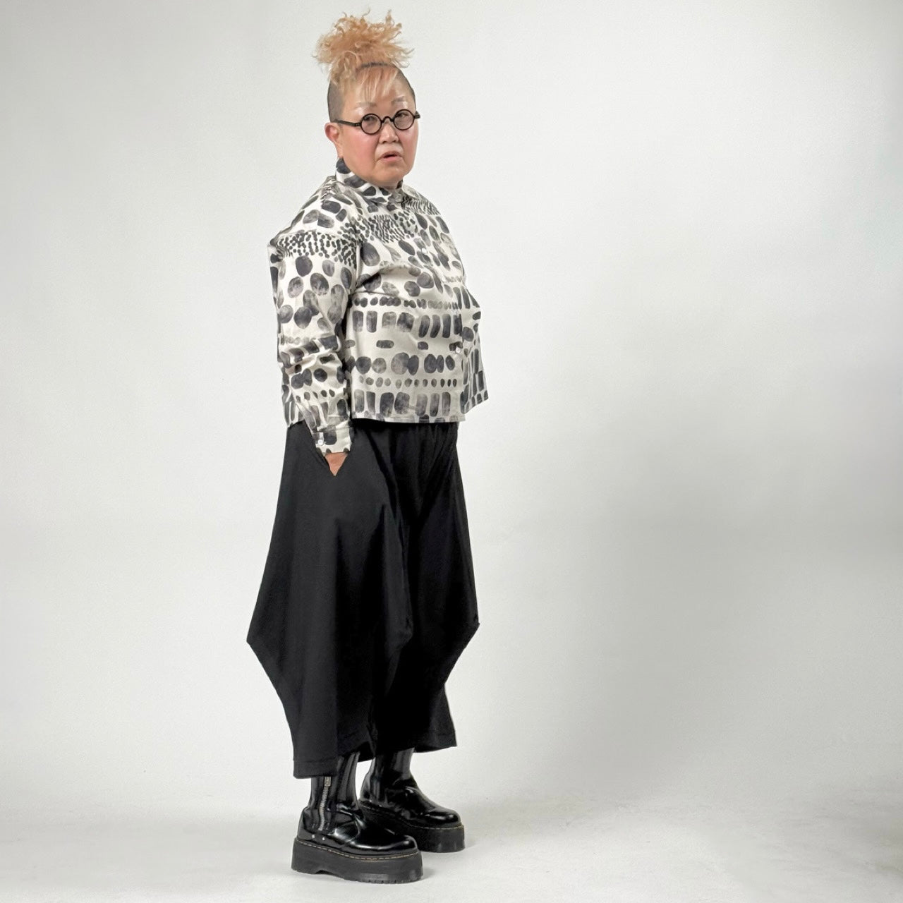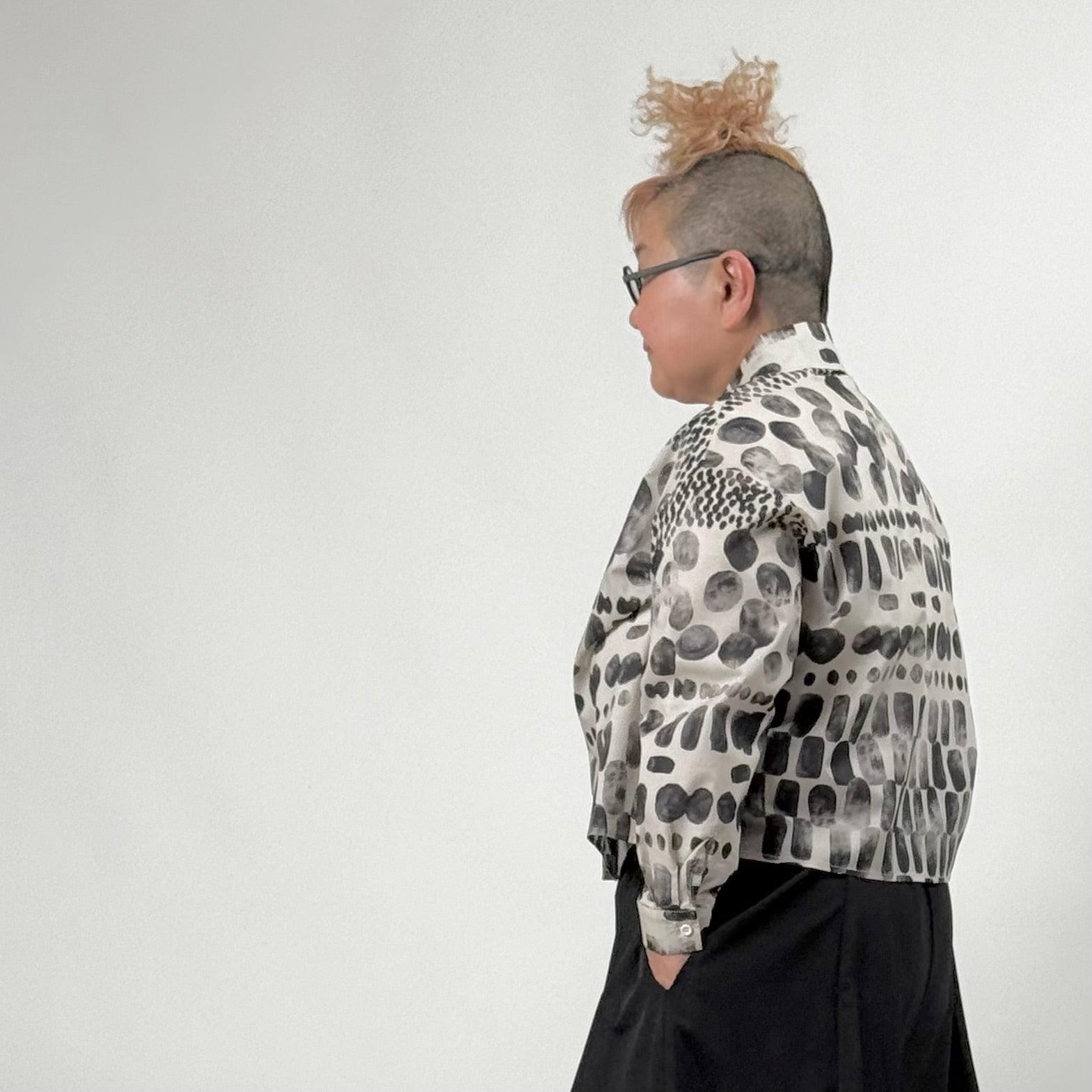 濃淡のあるモノトーンプリントで、個性的ながら大人らしい印象に仕上げました。