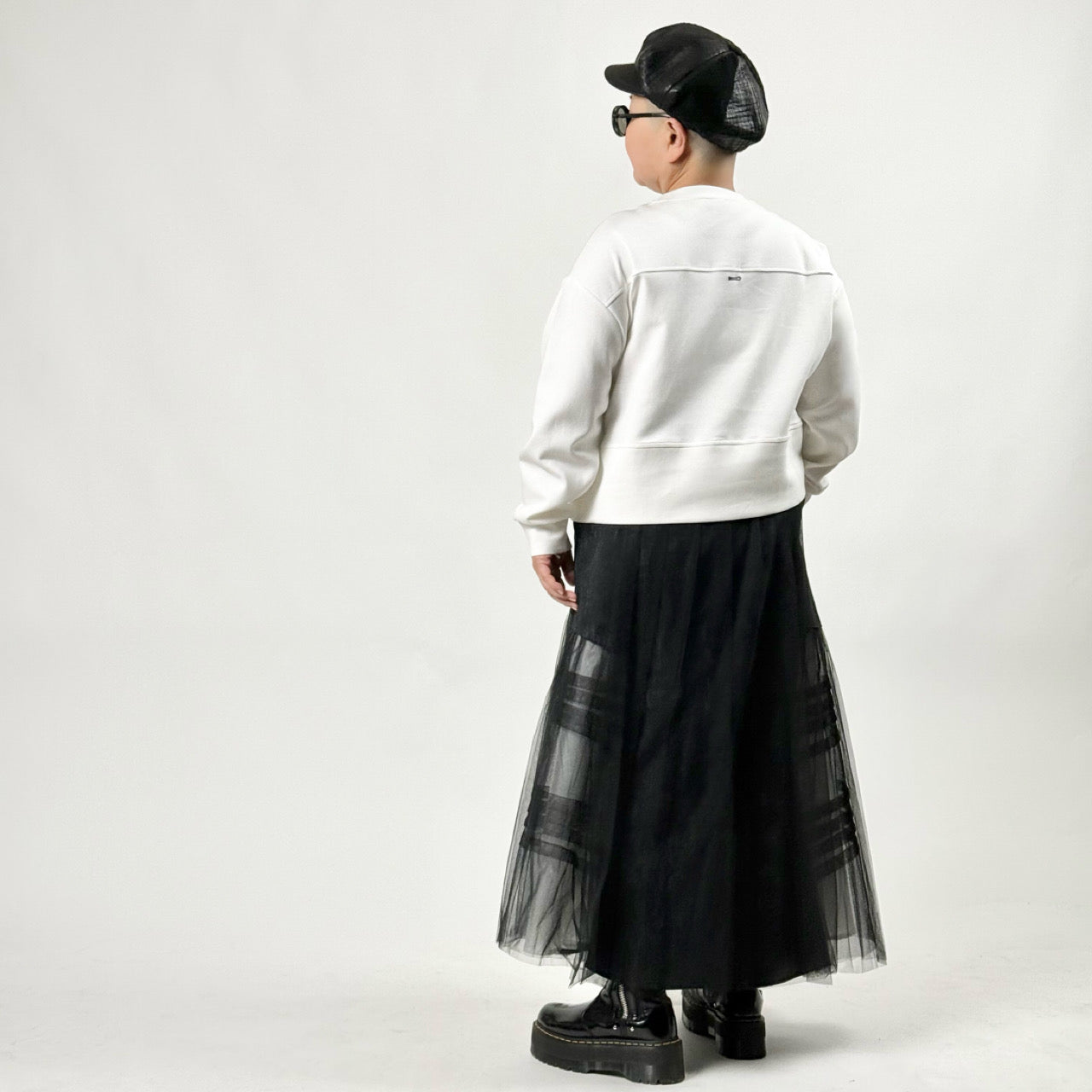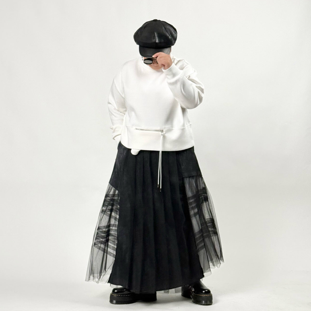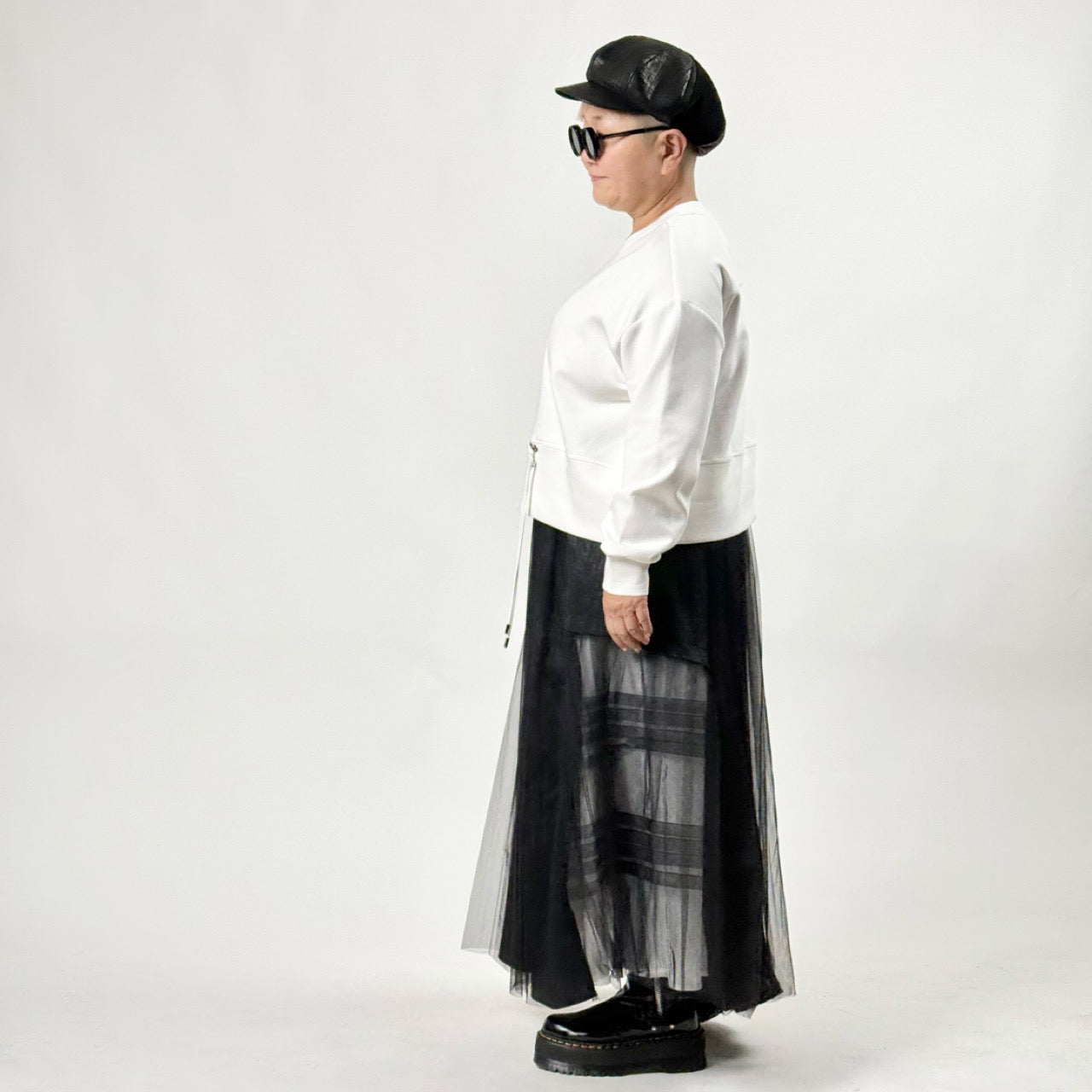 チュールとプリント素材を組み合わせ、両サイドに切替えラインを配置。