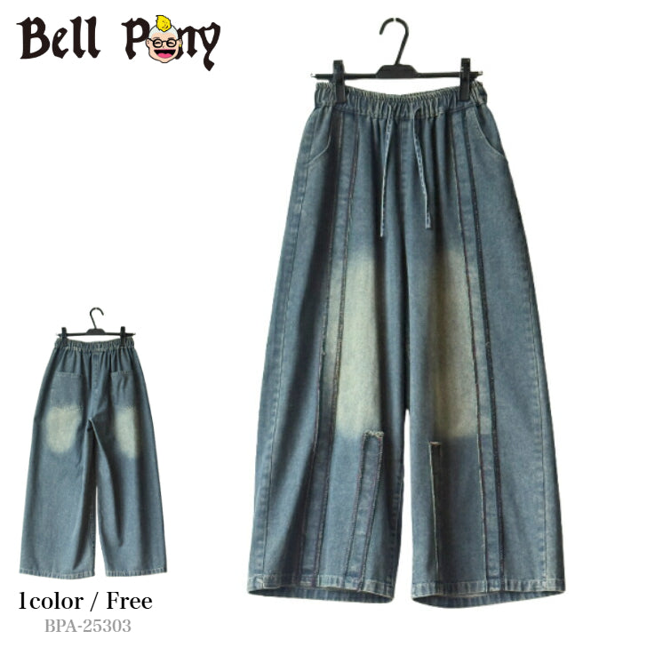 飾りステッチ刺繍 デニムワイドパンツ BPA-25303 [Bell Pony]